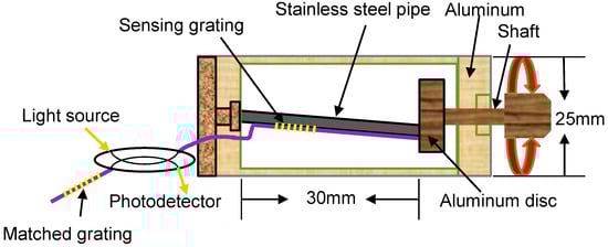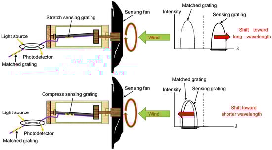 The sensing mechanism of the sensing head is illustrated in Figure 2. [] One edge of the disc is fixed to the end of the small stainless steel pipe, and the other edge is attached to the rotating shaft, which is extended axially through the cylinder. The other end of the rotating shaft is connected to a rotational fan, and the rotating shaft with the disc is synchronously rotated by the fan. When the fan is rotated, the sensing grating fixed on the steel pipe surface is stretched and compressed, which causes the grating wavelength to shift back and forth. Thus, if the original central wavelength of the matching grating is appropriately selected, the spectrum of the sensing grating shifts back and forth with the rotation of the fan, which creates a spectrum-overlapped frequency to be detected by using a photodetector as shown in Figure 3. An oscilloscope is employed to monitor the spectrum-overlapped frequency, which can then be used to determine the wind speed.