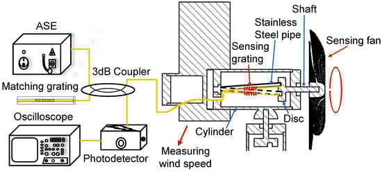 The sensing grating glued on the steel pipe head is shielded by an aluminum cylinder with a diameter of 25 mm. The aluminum shaft with a disc is driven by rotating a fan and is used for detecting wind speed. One end of the 1.5 mm-diameter steel pipe is fixed axially at the center of the nonshaft side of the aluminum cylinder, and another lead is mounted on the aluminum disc. A 20 mm-long shaft is extended inside the cylinder for being bonded with a 7 mm-diameter aluminum disc.