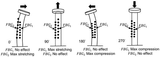 where and are the original central wavelengths of FBG1 and FBG2, respectively; and λFBG1 and λFBG2 represent the shifted central wavelengths of FBG1 and FBG2, respectively, when the small stainless steel pipe is rotated. Due to in Equation (2), the angle can only have the range from −90° (270°) to 90°. To obtain an overall expression from 0° to 360°, Equation (2) can be modified as follows: