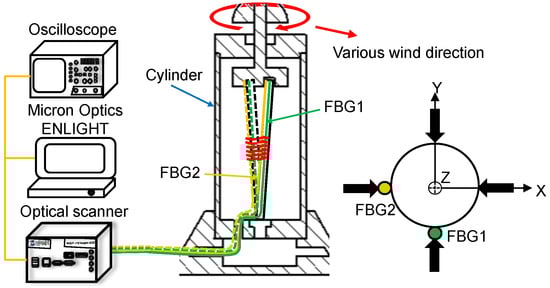 The sensing concept used for measuring wind direction is illustrated in Figure 4. Because the two FBGs with different central wavelengths are bonded to the small stainless steel pipe surface at a 90° separation, the shifts of the maximum and minimum central wavelengths are obtained when the steel pipe is rotated in the range from 0° to 360°. Therefore, the wind angle is identical to the rotation angle. By using the arc tangent function, we can determine the wind direction from the following three equations: