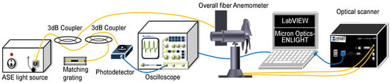 The overall experimental setup, including the fiber anemometer for measuring wind speed and direction, is displayed in Figure 6. For the sensing head used in wind-speed measurement, the central wavelength of the matching FBG is equal to the maximum wavelength shift of the sensing grating. Because the sensing grating is stretched by the stainless steel pipe, the grating wavelength is shifted toward the matching FBG, which creates an overlapped optical signal. The overlapped signal is reflected to the power meter, and the overlapped frequency is detected using an oscilloscope. By contrast, when the central wavelength of the sensing grating is outside the overlapped region, the power meter cannot detect any reflective signal. For measuring wind direction, while the shaft is being rotated by the rotor, the central wavelengths of the two FBGs are shifted and display sinusoidal variation with a phase difference of 90° between them. The rotation angle of the rotor is equivalent to the wind-direction angle. Thus, an optical scanner [] is used, with its internal light source connected to the fiber anemometer, to monitor the wavelength shift in the FBGs for obtaining the corresponding shaft angle variation and detecting wind direction.