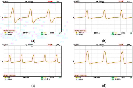 Oscilloscope diagrams for wind speeds (a) 200; (b) 400; (c) 600; and (d) 800 rpm.