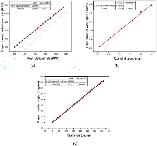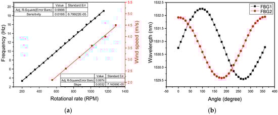 The plots of frequency and wind speed versus the rotational speed rate of the sensing fan are displayed in Figure 8a, where the slope of the black line is 0.0166. The relationship between the frequency (Hz) and rotational speed rate (R) can thus be described using the following equation: