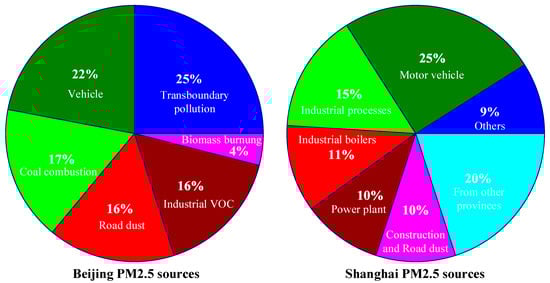 The Particulate Matter (PM)2.5 source pie charts of Beijing and Shanghai [20].