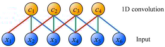 A one-dimensional (1D) convolution operation is shown in Figure 3. The difference between CNN and MLP is that CNN uses the concept of weight sharing. In Figure 3, x1 to x6 are inputs, and c1 to c4 are the feature maps after 1D convolution. What connects the input layer and convoluting layer are red, blue, and green connections. Each connection has its own weight value, and the connections of the same color have the same weight value. Therefore, in Figure 3, it only needs 3 weight values to perform the convolution operation. The advantage of CNN is that the training is relatively easy because the number of weights is less than that of fully-connected architecture. Moreover, important features can be effectively extracted.