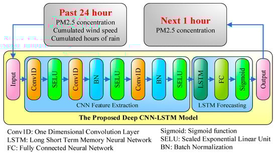 The architecture of the proposed APNet is shown in Figure 5. The inputs of APNet are the records of the PM2.5 concentration, cumulated wind speeds, and cumulated hours of rain over the last 24 h. The output is the PM2.5 concentration of the next hour. Different from traditional pure CNN or pure LSTM architectures, the first half of APNet is CNN, and used for feature extraction. The latter half of APNet is LSTM forecasting, which is used to analyze the features extracted by CNN and then to estimate the PM2.5 concentration of the next point in time. The CNN part of the APNet contains three 1D convolution layers. Moreover, to improve the efficiency, batch normalization is added after the second and third convolution layers of the APNet.