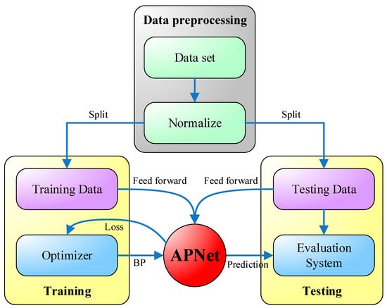 The system flow diagram of the proposed APNet is shown in Figure 6. During data processing, the original dataset first normalized, i.e., the numerical values of all dimensions are restricted to a range of 0 to 1, so as not to be overly partial to a certain dimension during training. Next, the normalized data is separated into two parts: training data and testing data. To keep the impartiality of performance evaluation, only the training data is used during the training, while the testing data is not used. Each time the training data are input to the APNet, a loss value is generated, according to which the optimizer uses a backpropagation method to adjust the parameters of APNet. The forecast result of APNet will be more and more accurate with the increase of training iterations. After the APNet training is finished, the testing data is input into the APNet, and the testing results and real results are compared to evaluate the performance of the APNet.