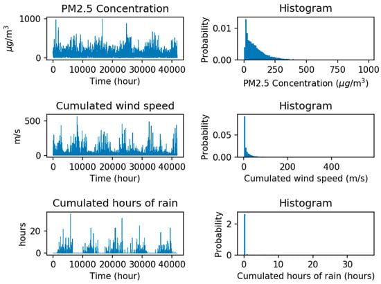 Beijing is a cosmopolis with a population of more than 21.5 million, and Particulate Matter (PM) is one of the main factors that affect human health directly [51]. Thus, the PM2.5 dataset of Beijing is selected for this study. Figure 7 shows the weather condition, pollution degree reported and its histograms in each hour by the US embassy in Beijing, China, from 2010 to 2014. The dataset includes PM2.5 concentration, cumulated wind speed, and cumulated hours of rain. In this experiment, information from these factors over the past 24 h are used to forecast the PM2.5 concentration of the next hour. These three types of useful information are expected to be integrated into the machine learning model to perform supervised learning and analysis, to realize accurate forecasting.