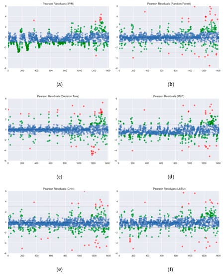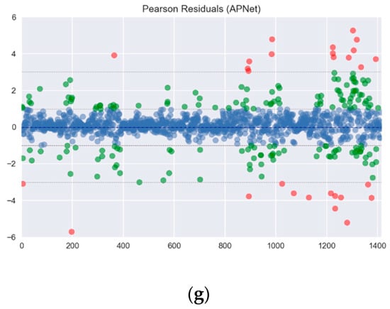 The Pearson residuals of all forecasting methods: (a) Partial results A; (b) Partial results B; (c) Partial results C; (d) Partial results D; (e) Partial results E; (f) Partial results F; (g) Partial results G.