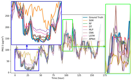 Figure 9 shows the detailed comparison results of each model, where the blue bold line refers to the real data, and the other colored lines are the forecast results of each algorithm. As shown in the blue frame of Figure 9, the forecast results of SVM barely coincided with the actual results. Among all the algorithms, the performances of RF, MLP, CNN, LSTM, and APNet are better. As shown in the green frame of Figure 9, when the PM2.5 pollution source concentration is unstable, the forecasting result of many algorithms could not follow the real trend and showed a rather disordered pattern. This also indicates that it is still difficult in terms of PM2.5 forecasting. Overall, the performances of CNN and LSTM are very stable and accurate, but the CNN-LSTM based APNet proposed in this paper is even better. The forecasting ability of APNet for PM2.5 forecasting is also verified in this experiment.