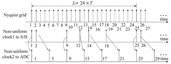 An example of the sampling process is given in Figure 3, where , , and . The first coset can be sampled directly, while the second coset must be firstly sampled by the S/H and subsequently captured by the following ADC on the fifth Nyquist time grid. Thus, the third coset must be greater than or equal to 5, otherwise, it will lose the last coset . The cooperation between the first and the second periodic non-uniform sampling clock ensures that two adjacent cosets with only time difference can be captured by an ADC with sampling rate which is much lower than , and this is the essence of the proposed serial MCS.