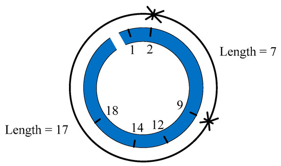 Next, we briefly introduce the concept of the circular sparse ruler. A L-length circular sparse ruler can be viewed as a ruler with only marks which is less than L, but it is also able to measure all the length between 1 and L. Define the marks as , and their difference set , where is the modulus operator. A set is a circular sparse ruler if its difference set . An example of the circular sparse ruler is given in Figure 4, where the marks are and the measurement range is . Although there is no mark 7 and 17 on the sparse ruler, length 7 and 17 can be measured using mark 2 and 9.