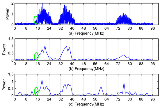 In the first simulation, we test the feasibility of spectrum sensing using power spectrum at partial frequency bins. To show the estimated frequency-smoothed power spectrum clearly, we only observed 12 of these 40 channels. In the following two simulations, 32 of these 40 channels are observed. The parameters of MCS are set as , and the sampling pattern is . The number of active primary users is set as . The SNR of the test signal is set as 10 dB, and the acquisition time is set as 64 μS. Figure 5a shows the original power spectrum of the test signal. Figure 5b,c show the estimated frequency-smoothed power spectrum at partial frequency bins using the proposed serial MCS and the traditional parallel MCS, respectively.