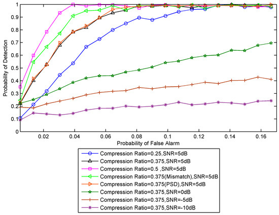 In the second simulation, we evaluate spectrum-sensing performance in terms of different compression ratio. 32 channels are observed in this simulation. Its bandwidth and Nyquist sampling rate are 256 MHz and 512 MSPS (Mega-Samples Per Second), respectively. We consider several SNRs and they are 5 dB, 0 dB, −5 dB and −10 dB. The periodicity of the sampling instants is set as in MCS. Several compression ratio are considered, and they are 0.25, 0.375 and 0.5. The sampling pattern for compression ratio 0.25 is , and the sampling rate requirement for ADC is 128 MSPS. The sampling pattern for compression ratio 0.375 is , and the sampling rate requirement for ADC is 192 MSPS. The sampling pattern for compression ratio 0.5 is , and the sampling rate requirement for ADC is 256 MSPS. The number of active primary users is set as . The acquisition time is set as 64 μS.