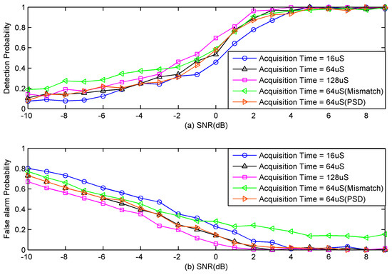 Influence of acquisition time on spectrum-sensing performance. (a) Detection probability. (b) False alarm probability.