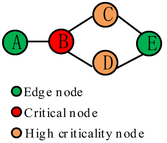 In WSN, a node usually behaves as both a data source and a data router [9,10,11]. The sensory data traffic follows a many-to-one pattern, where relay nodes tend to be congested as they are not only collecting and processing but also relaying data from nodes farther away. A node can be called critical node if it plays an irreplaceable role as a relay node in some routing paths. When a critical node depletes its energy, some other nodes that send their sensory data to the base station via this node can’t find an alternative routing path and become disconnected from the base station, which will make the network suffer data loss. In practical WSN, although the critical nodes are rare due to the dense deployment of nodes, there still exist some nodes that have a potential to be critical nodes, which are referred to as high criticality nodes in this paper. For example, as shown in Figure 1, there are the two paths A-B-C-E and A-B-D-E from node A to node E. Obviously, node B is a critical node that is irreplaceable in two paths. Node C and Node D are the high criticality nodes which will become critical node when the other is inactive. Thus, the high criticality node can also play a ‘bridging’ role in keeping the network connected, and the higher the criticality of a node is, the greater possibility to become critical node it owns. In order to decrease the risk of data loss, for the mobile charger, it is vital to charge as many high criticality nodes include critical nodes as possible before their batteries are depleted. To realize this, there is a question needed to be answered: How to quantify the criticality of nodes that the mobile charger can be scheduled to charge them effectively?