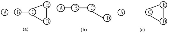 Figure 3. Example of network. (a) The original network; (b) The network of node E removed; (c) The network of node B removed.