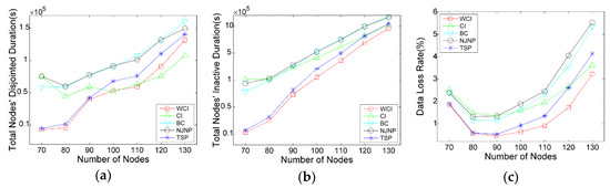 Figure 5. Impact of | N | on the charging scheduling algorithms: (a) Total nodes’ disjointed time; (b) Total nodes’ inactive time; (c) Network’s data loss rate.
