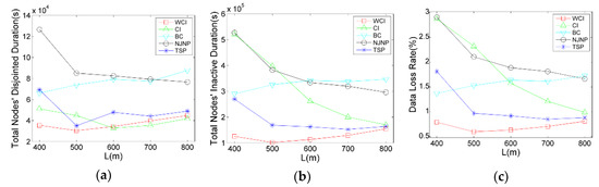 Figure 6. Impact of L on the charging scheduling algorithms: (a) Total nodes’ disjointed time; (b) Total nodes’ inactive time; (c) Network’s data loss rate.