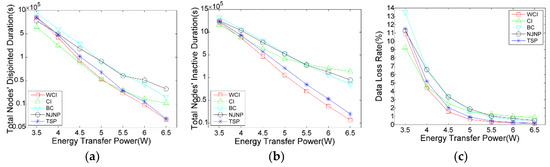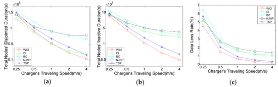 Figure 8. Impact of p r on the charging scheduling algorithms: (a) Total nodes’ disjointed time; (b) Total nodes’ inactive time; (c) Network’s data loss rate.