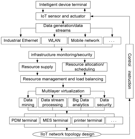 When designing the network according to the above IIoT design strategy process, we need to consider the structural characteristics and functional requirements of the network itself. In general, the IoT network has three layers: data acquisition layer, network transfer layer and data application layer [31] (Figure 2). In the actual network topology design, we need to deploy it according to the characteristics of each layer.