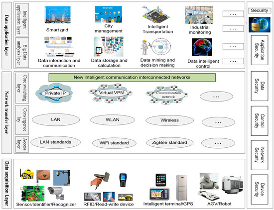 In Figure 2, the main function the of data acquisition layer is to identify objects collect data; it includes sensors, RFID, Quick Response (QR) code, ZigBee, Bluetooth, etc. The network transfer layer includes mobile communication network, wireless sensor network, etc. It is used to deeply integrate network and transfer the data to the whole network. The data application layer can build an intelligent functional application platform for business requirements, and provide solutions for different users after analyzing and processing data, such as using cloud computing, artificial intelligence, large data analysis and other technologies. There are different security problems in the hierarchical structure of IoT network, which we group into five aspects, according to the basic principles of deep security defense: application security, data security, control security, network security and device security [32].