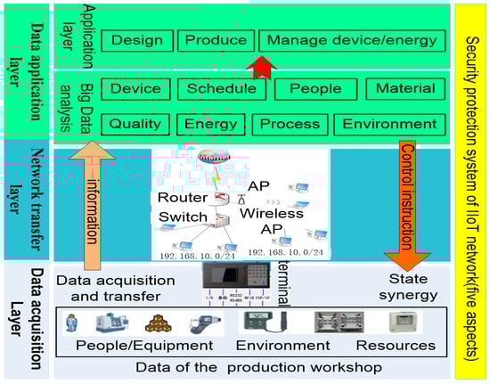 In Figure 3, the data acquisition layer is used to identify and collect the state and data from people, equipment and raw materials. The data are transmitted to the data application layer through the network equipment, such as router, switches and other network devices in the network transfer layer. At the same time, the control instructions from the data application layer are also sent to the bottom of the network to control the production factors.