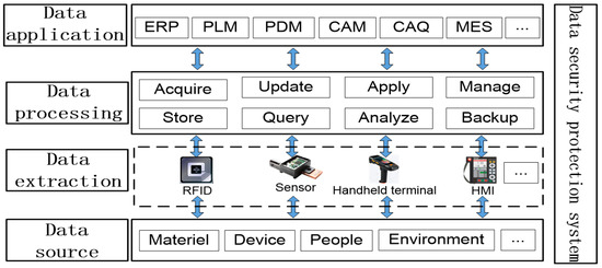 The data acquisition layer is composed of CNC machines, robots, operation terminals, PLC, RFID, etc. The network transfer layer is responsible for sending data to the application layer, including wired network, wireless network, etc. The data can be used for control and service of production line after data analysis and processing.