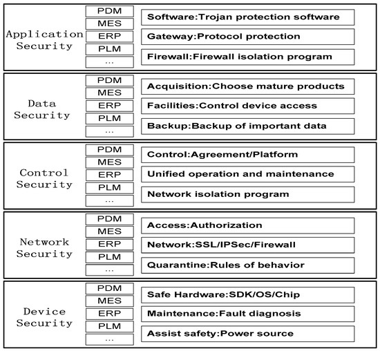With the development of the production control system in the direction of intelligence, network and complexity, there are many kinds of production factors and complex data in the system, as well as many interconnected relationships among them; the complexity environment could easily cause security problems in the system [34]. Therefore, it is urgent to establish a perfect safety protection system to provide a guarantee for the safe operation of the production system. The security problems of the production system are mainly from the physical layer and the network layer. The physical layer includes the reliability of the sensors, actuators and controllers in the production system. The network layer includes data packet loss, delay, error code and leakage. Therefore, the topology design of the IIoT network needs to be able to prevent the system from being destroyed, minimize the damage and rapidly recover. The security protection system (Figure 5) is established according to the characteristics of the production system and the IoT solution components running in the various layers of the network. It can be analyzed from the aspects of device security, network security, control security, application security and data security. Safety measures are taken to ensure the safe operation of the production system.