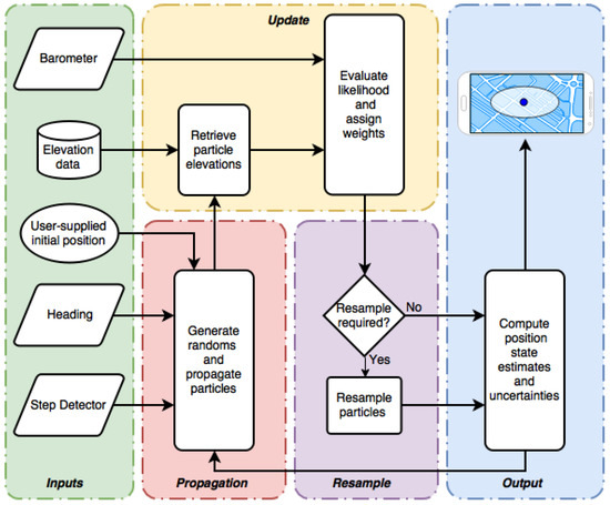 After the update stage, a resampling scheme is executed, if needed, which replaces particles with negligible weights with highly weighted particles (see Section 2.4.1). This effectively kills off particles that are likely carrying incorrect state estimates, and adds more particles to areas within the state space which are more likely to be correct. Lastly, the position estimate and associated uncertainty is computed from the weighted particles (see Equations (8) and (9)) and displayed on the smartphone’s display as a location marker and error ellipse in the output stage (blue). The particles used for this computation are either continually updated as new barometer measurements become available or are propagated again once the next step is detected.