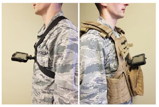 Data collection consisted of walking routes with chest-mounted smartphones running the application developed for this research. The chest mounts used are shown in Figure 2. The smartphone models tested include the Samsung Galaxy S7, Motorola Nexus 6, and LG Nexus 5X. In addition to monitoring the real-time display during the experiments, the sensor data was recorded and replayed through an Android Studio-emulated smartphone configured with the same software but loaded with a different DEM. This was repeated for each DEM source acquired for this research, allowing for a comparison of the algorithm’s performance for a given route with respect to DEM accuracy and resolution.