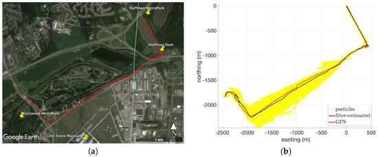 Detailed results from Route 2 in Table 2 using USGS10 are presented below to further demonstrate the performance of the system on flat terrain. Figure 3a shows an overhead view of Route 2. This route consists of a pedestrian and biking path that connects two parks in the greater Dayton, Ohio area and crosses over the Huffman Dam bridge and under two highway overpasses near the Eastern portion of the route. The filter-estimated and GPS routes from this experiment are plotted in Figure 3b. The particles (yellow) are concentrated in the first leg of the route but spread out significantly in the second leg of the route. This happens because the second leg is very flat, with approximately 2 m of elevation change over a 1.4 km distance and very little diversity in the surrounding terrain. In effect, the reduced amount of spatial information available to the particle filter in the second leg of the route allows particles to survive longer without being killed off during resampling. In the third leg, the particle filter tracks two potential solutions and eventually settles on the correct one before the route is terminated.