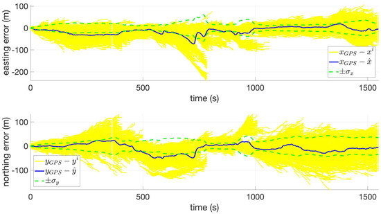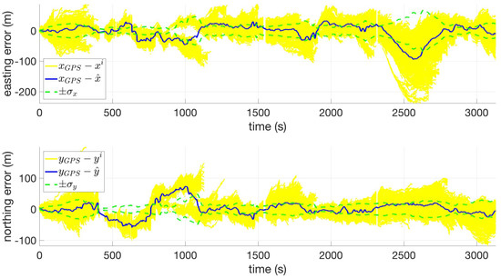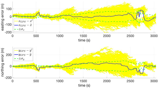 Figure 6 shows the estimate errors for the position states. The errors in these states are mostly bounded by the filter-predicted standard deviation, and this is especially true in the second half of the route. An interesting feature can be seen around t = 800 s, at which point the filter resamples, effectively killing off erroneous particles and locking onto the correct solution. Also, note that the magnitude of the filter-predicted standard deviations for the position states are less than ±50 m for most of the route, whereas these magnitudes reach as much as ±100 m for the flat terrain route shown in Figure 4. This effect can be attributed to the variation in the slanted terrain, which allows the particle filter to resample particles more frequently and limits the uncertainty growth.