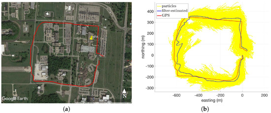 Overhead views of Route 2: (a) Google Earth satellite imagery [26]; (b) Global Positioning System (GPS) and filter-estimated paths in local level coordinate frame (using USGS10).