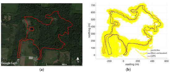 In practice, the true elevation returned from (, ) is not directly available but is instead inferred from an interpolated DEM. This interpolated elevation is prone to error due to inaccuracies in the underlying data and interpolation error (the latter being especially true for DEMs with coarse resolution). Since the DEM is not a perfect representation of the true elevation, another term should exist in Equation (6) which models DEM error. These errors were not explicitly modeled in our implementation because doing so would significantly increase the number of particles required. Additionally, the barometric elevation bias state and measurement noise terms were able to account for these errors adequately in most cases.