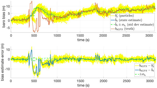 Baro bias (top) and baro bias estimate error (bottom) versus time for Route 14 using USGS30.