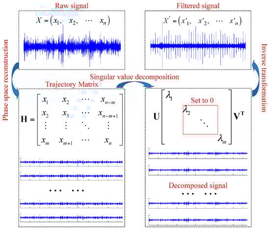 This section illustrates the mechanism of SVD filtering: The signal trajectory matrix is reconstructed based on the embedded dimension obtained from FNN. Then the trajectory matrix is subject to SVD, which is helpful to acquire all the combinations of SV and decomposed signals. SV combination changes the decomposed signal back to one-dimensional signals; if the SV combination can represent the fault signal information, the signal changed back only contains the fault signal information, which is the whole process of signal filtering. A schematic diagram is shown in Figure 1.