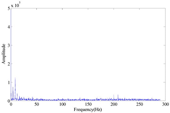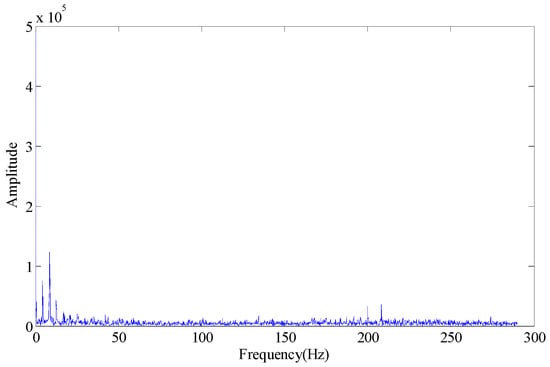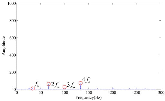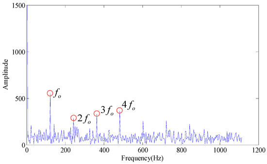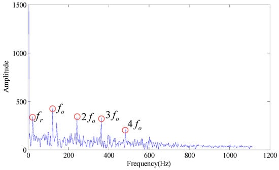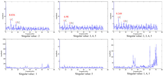 Wherein, fo is the outer race fault characteristic frequency. According to Figure 3, some trends can be observed in the fault characteristic frequency, but the effect is not obvious. When the first few larger SVs are set at zero (the first SV to fourth SV), the envelope spectrum obtained is as shown in Figure 4. If we set the first two SVs and last two SVs at the same time (the 1st, 2nd, 7th and 8th SV), the effect on the envelope spectrum is as shown in Figure 5.