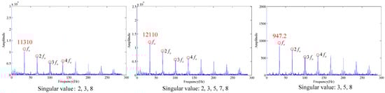 As shown in the Figure 21, the three figures above can all accurately distinguish the fault characteristic frequency, in which the energy is the strongest for the combination that only contains singular value 2 (the first subfigure in Figure 21), also with optimal filtering effect, and the fault is accurately diagnosed at the same time.