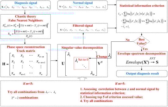 The signal trajectory matrix is reconstructed according to the false nearest neighbor theory of chaotic phase space reconstruction, and the SVD and statistical information criteria can be used to effectively filter the signals. The procedure is as shown in Figure 8.