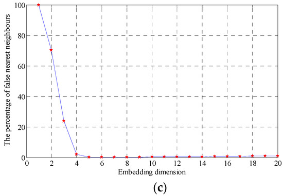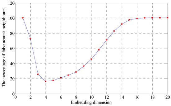 False nearest neighbors [28] is an effective method for calculating the embedding dimension. According to the geometric theory, the chaos time series can be regarded as the projection of chaotic motion of high-dimension phase space on low-dimension space-time. In the projection process, the chaotic motion trajectory will be distorted, and after projection, two original nonadjacent points in high dimensional phase space may become two adjacent points in low-dimension space-time, namely false nearest neighbor points. Phase space reconstruction is a method to recover chaotic motion trajectories from chaotic time series, which can be used to evaluate the existence of nearest neighbor points. Specifically, in m-dimensional space, the phase point is x(t) = {x(t), x(t + ),…, x(t + (m − 1))}, t = 1, 2, …, m; is time delay; each phase point has nearest neighbor point at certain distance Xf, with distance of Rm(t) = ‖‖. When the dimensional number of phase space is increased from m to m + 1, the distance between the two phase points will change, and the distance is changed to:
