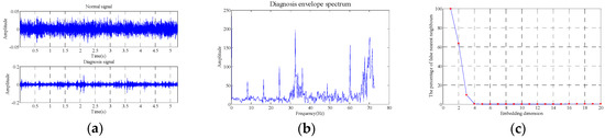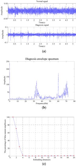 The data length selected is 262,144 (5.24288 s). The comparisons between roller fault signal and signal in normal state in time-domain waveform, envelope spectrum and the results obtained with false nearest neighbor (maximum dimension number of 20 and delay time of 1) are as shown in Figure 19.