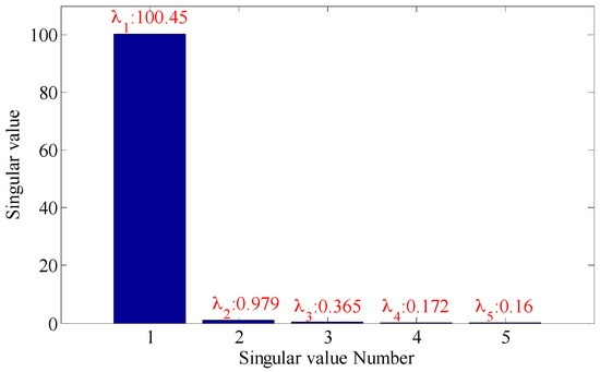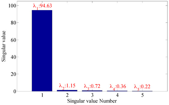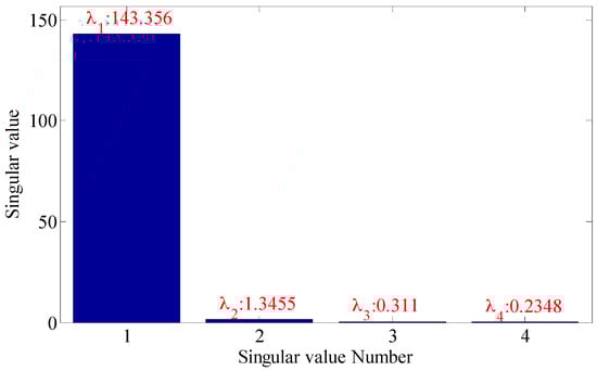As shown in the Figure 16, the embedding dimension number is optimal at 4, so the embedding dimension number 4 is selected to perform the trajectory matrix reconstruction on the signals and perform SVD on the matrix. The SVs obtained are as shown in Figure 17.