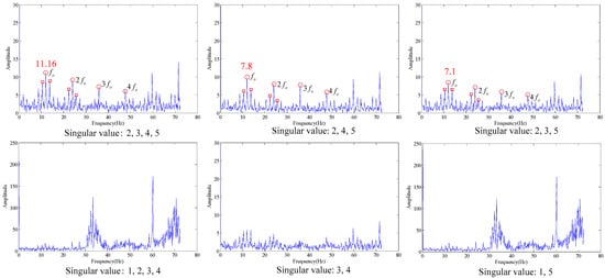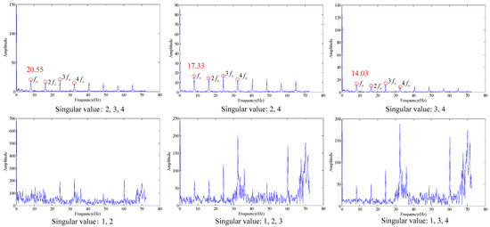 As shown in the Table 6, when the SV is 1, the similarity is the maximum, and the optimal SV combination at this time is 2, 3 and 4. The verification of its combination is as shown in Figure 18. As shown in the Figure 18, where the three figures can be used to accurately distinguish fault characteristic frequencies, in which the energy corresponding to combination 2, 3 and 4 is the strongest (20.55), and it also has the optimal filtering effect, and the fault is accurately diagnosed.