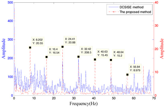 To verify the advancement of the proposed method, this section compares it with the method published in [20]. The paper used a difference curvature spectrum of incremental singular entropy (DCSISE) to determine the number of effective singular values. The detailed algorithm steps are shown in the reference. The experiment data is the same as Section 5.2.2 (outer race fault). The envelope spectrum of two methods is shown in Figure 26.