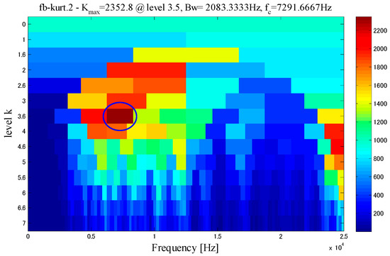 In order to furtherly verify the effectiveness of the proposed method, this study compared the inner race at low-speed bearing fault signal with the Fast Kurtogram diagnosis method. The method is described in [32], and the Fast Kurtogram is shown in Figure 27.
