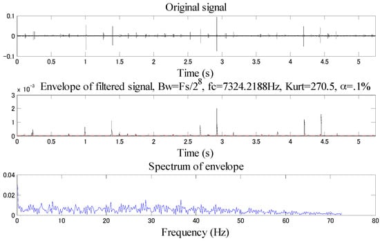 As shown in the Figure 27, the spectrum kurtosis is the maximum when the central frequency is 7291.6667 Hz, and the bandwidth is 2083.33 Hz. The filtering is performed with such data to obtain the filtered original waveform (time domain), envelope signal and envelope spectrum, see Figure 28.