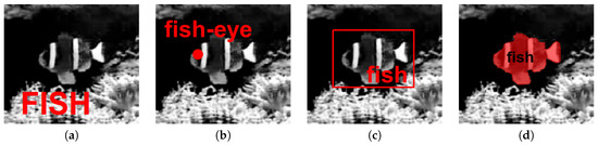 Types of 2D image annotation: (a) image tag; (b) landmark point; (c) bounding box; (d) individual pixels. Image from Fish4Knowledge dataset [3].