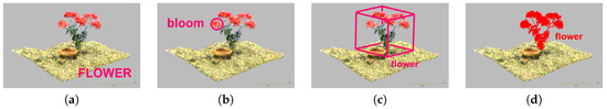 Types of 3D model annotation: (a) model tag; (b) landmark point; (c) bounding box; (d) individual points. Point cloud from 3DRMS dataset [15].