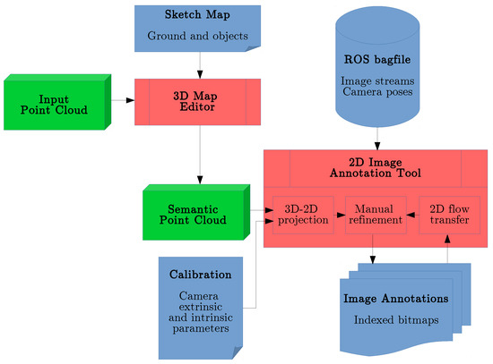 Semantic annotation workflow. In the first stage, the acquired point cloud representing the scene geometry is enriched with semantic information using the 3D Map Editor (upper red box). Label transfer from the user-supplied sketch map starts the process. In the second stage, the captured image streams are loaded in the 2D Image Annotation Tool, where each frame annotation is pixel-wise initialized either from the projected 3D model or transferred from the previous frame using optical flow. The user interface then allows for manual correction of the semantic image map (lower red box).